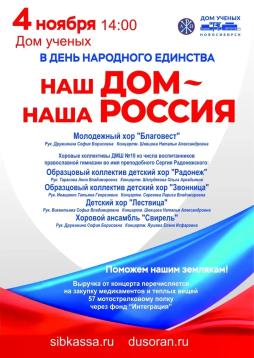 4 ноября в 14:00 в Доме учёных Новосибирского Академгородка состоится концерт "НАШ ДОМ-НАША РОССИЯ". В программе выступление вокальных коллективов.